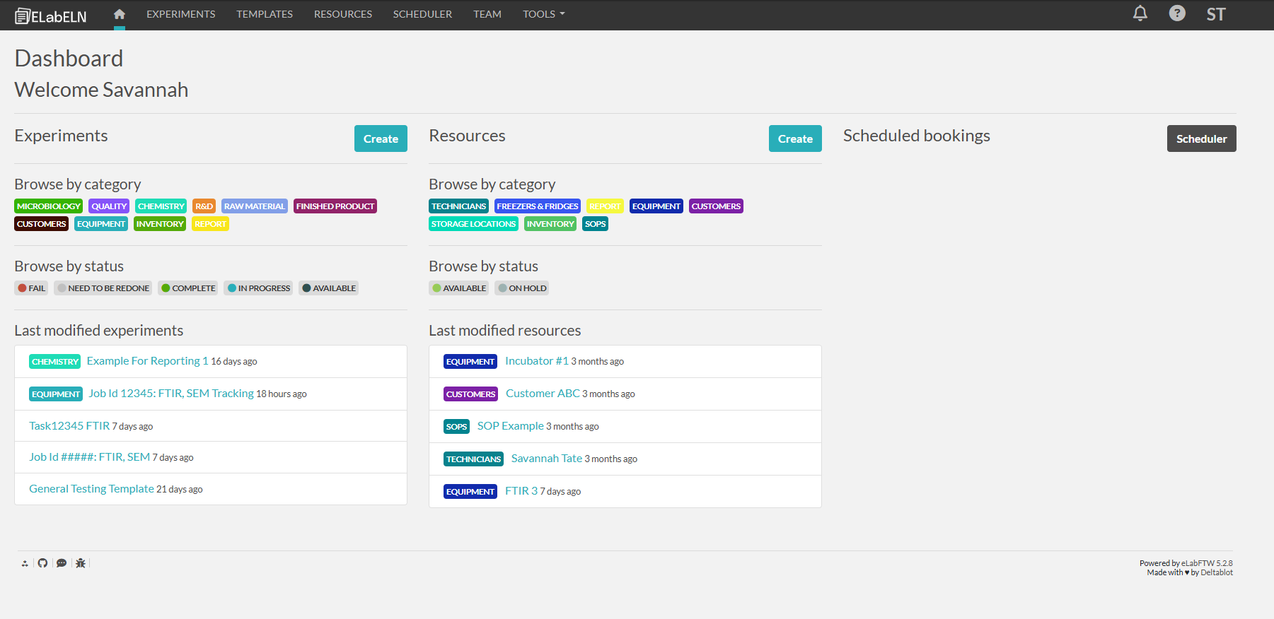 The dashboard gives you an overview of experiment and resource categories and statuses, as well as recently edited pages. You can also see the schedular upcoming events