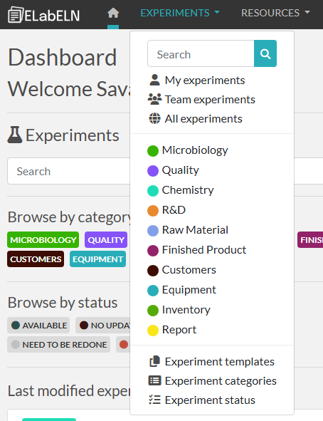 - Clicking Experiments will open the list of ways to open experiments, templates, categories and statuses so that you can choose exactly what part of experiments you want to interact with. Clicking on one of the experiment categories will open a list filtered for that category. You can also search for a specific experiment with the search bar. Opening the templates, categories, or status will take you to the where you can then manage those items.