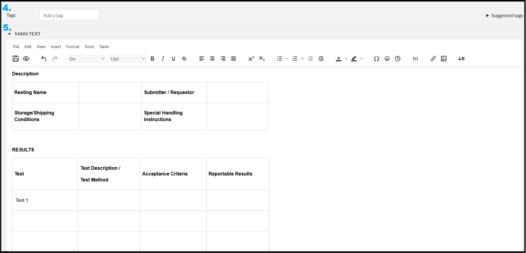The main text field includes a variety of options for tracking data. Click each tab to see additional formatting abilities: File, Edit, View, Insert, Format, Tools, Table.