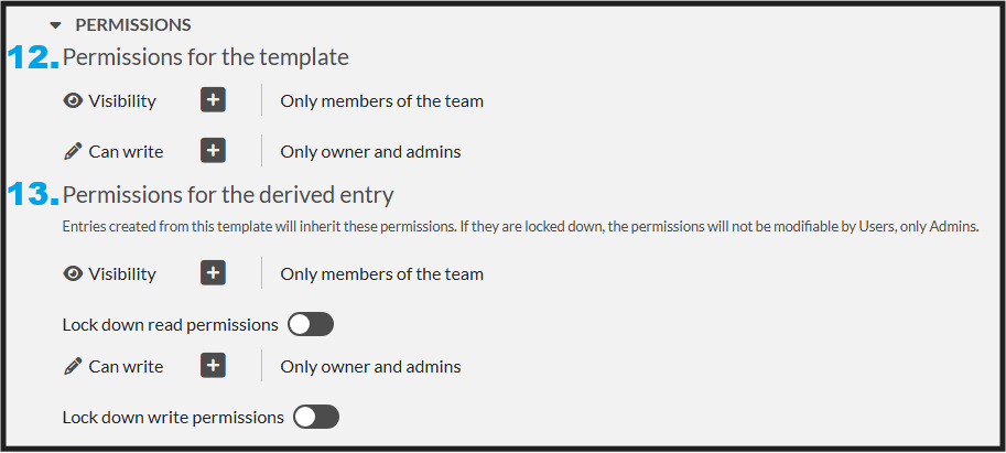 Permissions for the Derived Experiment are to set permissions for who can see the newly created experiments and who can edit that experiment. The template can lock the permissions for derived experiments so that the permissions can not be changed.