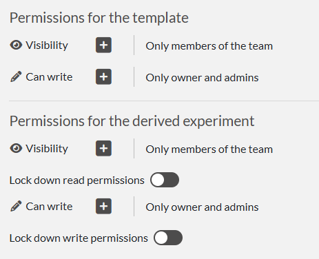Permissions can be set for visibility and editing for Experiment Templates and individual Experiments by Team, User Groups, and User. The permissions can be managed on the Template for the template itself and for any derived experiments. At the template, you can lock permissions so that they cannot be edited for derived experiments.