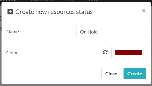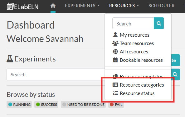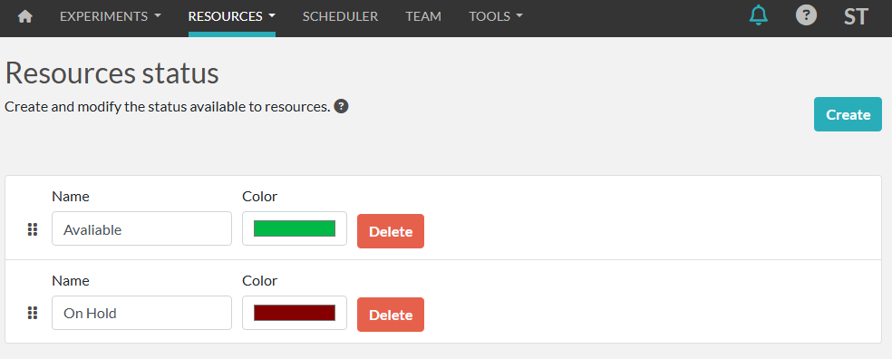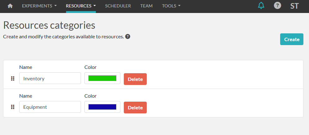 Resources can be categorized with Categories and Statuses. You can manage category and status names and colors by clicking on the Resource tab in the menu, then either clicking Resource Categories or Resource Status: