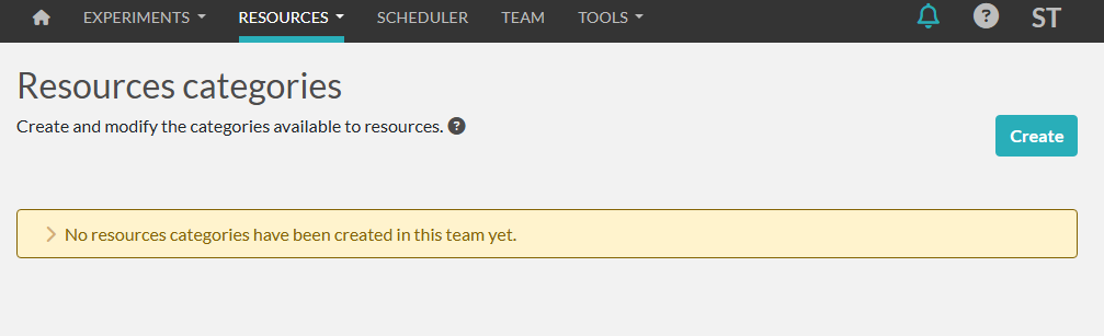 When you click Resource Categories from the resources tab in the menu, you will see the Create button to add new categories.