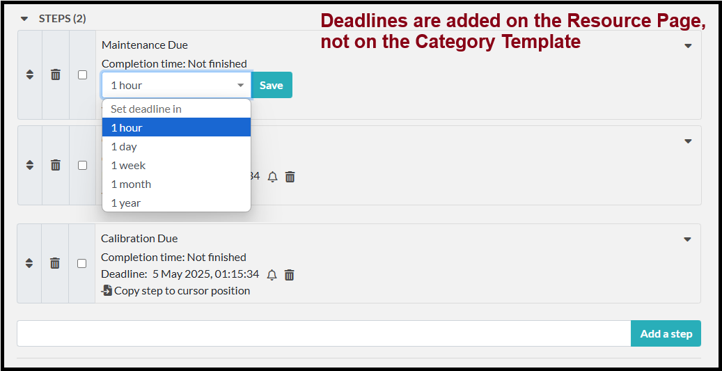 Steps can be added to the Resource Category Template and edited for each individual resource.