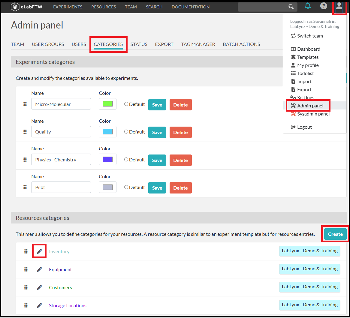The color for this Resource Category is used for easy identification throughout the ELN.