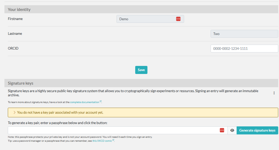 Enter in a passphrase specific to your signature here and you'll be ready to start signing in the ELabELN!