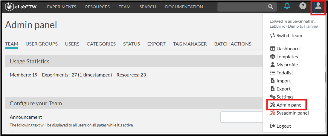 The ELabFTW Admin Panel can be accessed through the User Menu.