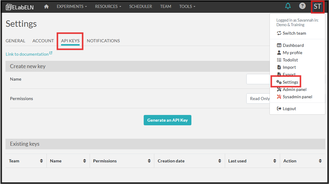 API keys can be created and viewed under the API Keys tab in the settings menu.