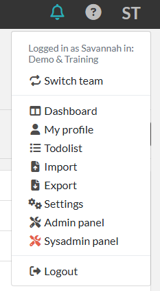 - Clicking your initials in the top right will open the users menu, with links to settings, admin and sysadmin panels, and other functions.