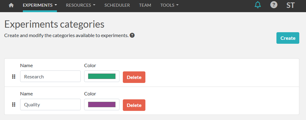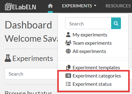 Experiments can be categorized with Categories and Statuses. You can manage category and status names and colors by clicking on the Experiment tab in the menu, then either clicking Experiment Categories or Experiment Status: