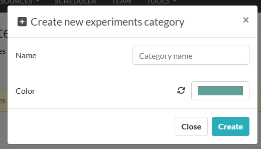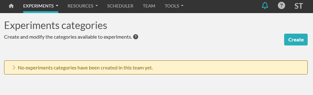 When you click Experiment Categories from the experiments tab in the menu, you will see the Create button to add new categories.