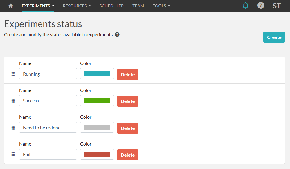When you click Experiment Status from the experiments tab in the menu, you will see the statuses that come preloaded. You can edit these names and colors and add/delete statuses as needed.