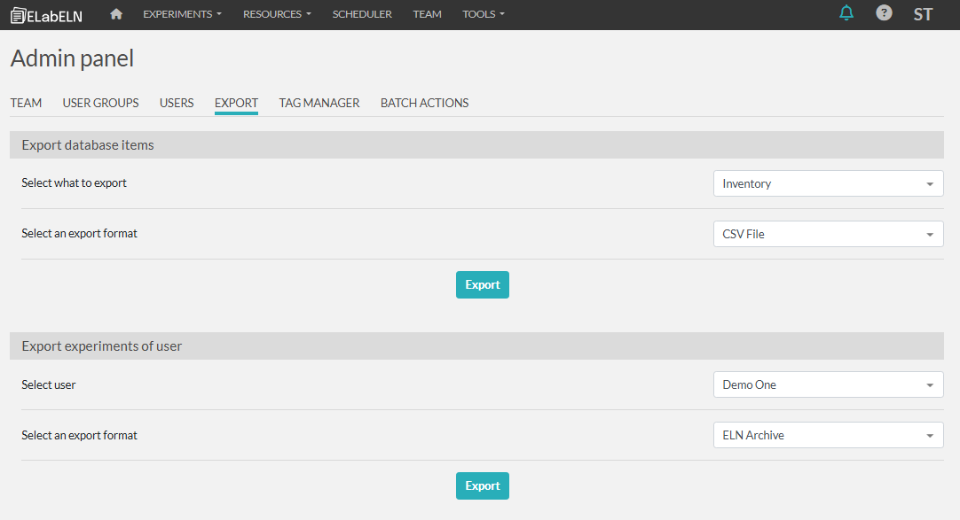 The Admin panel includes a tab for exporting resources and experiments.