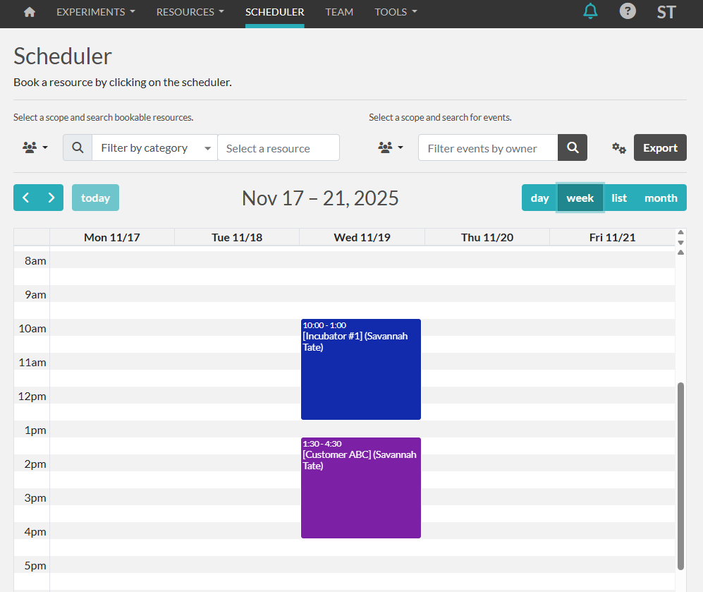 You can also add resource bookings directly from the scheduler by filtering and selecting the resource on screen. The calendar will show the bookings color-coded based on the category color.