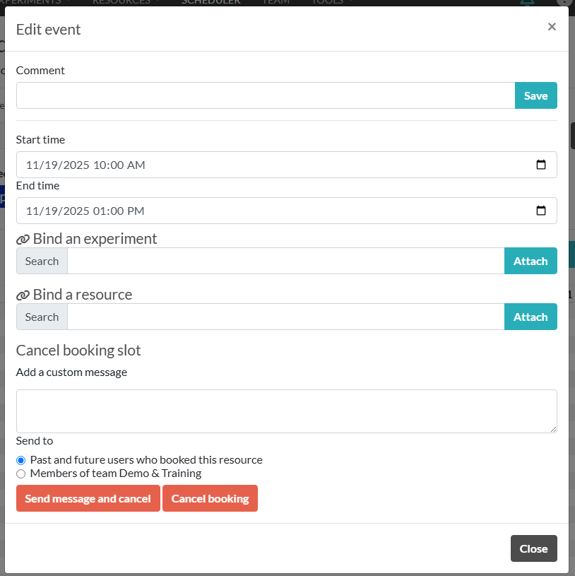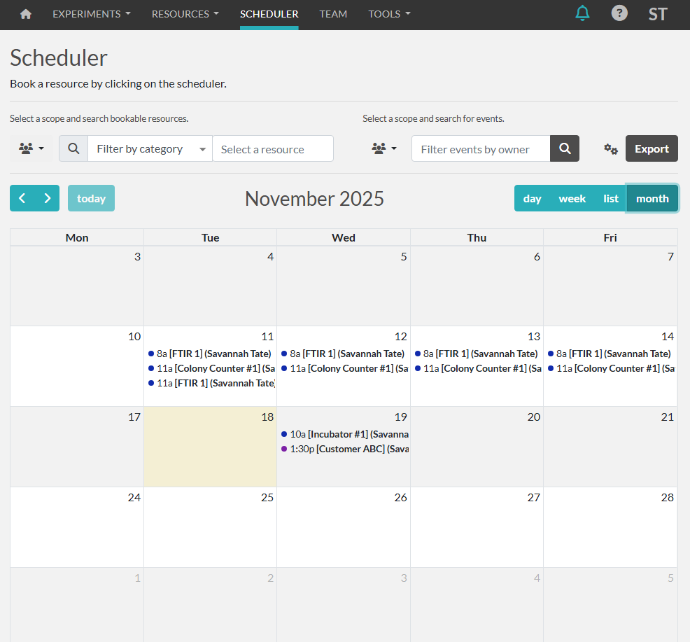 Resources can be booked on their resource page or on the scheduler calendar from the dashboard.