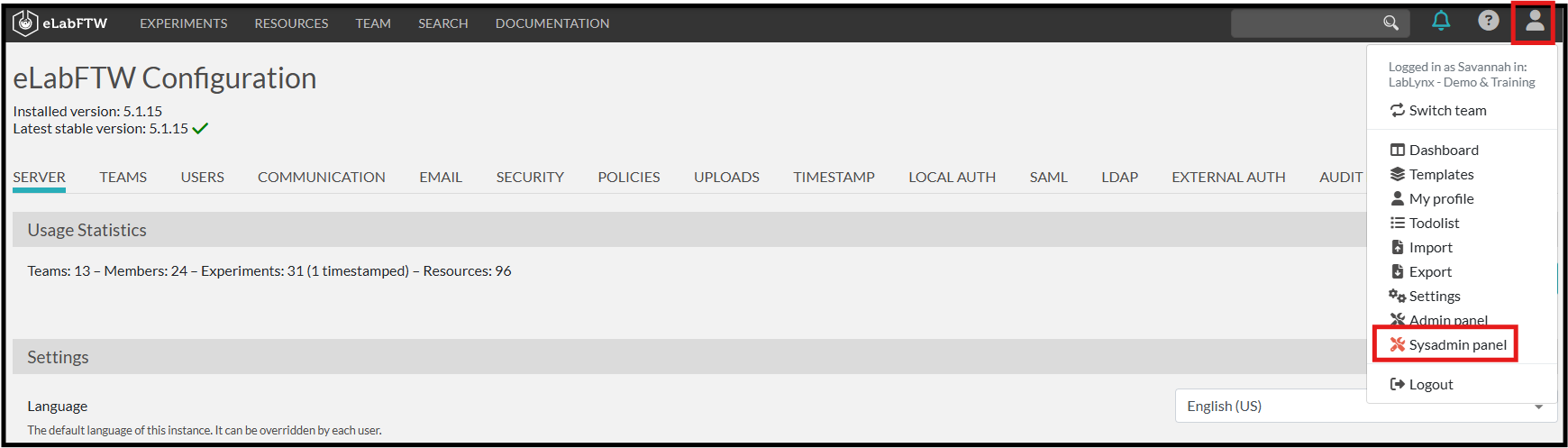The ELabFTW Sysdmin Panel can be accessed through the User Menu.