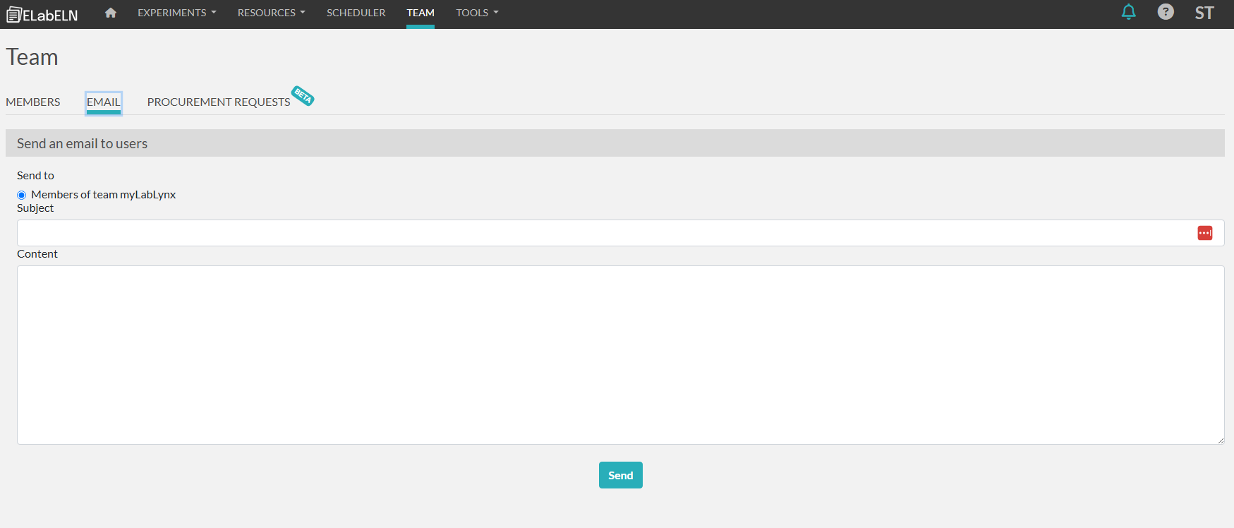 The email tab can be used to email the users in your team or your group within the team.