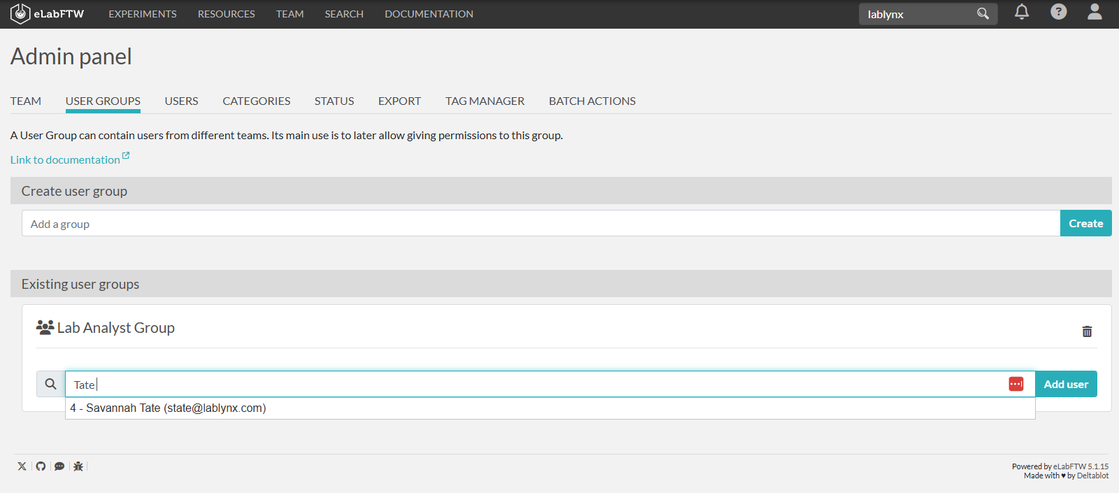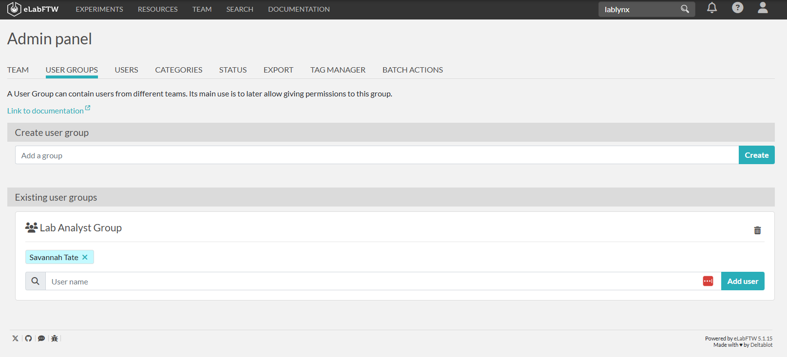 - You can add new User Groups by typing in the Use Group Name and clicking create.