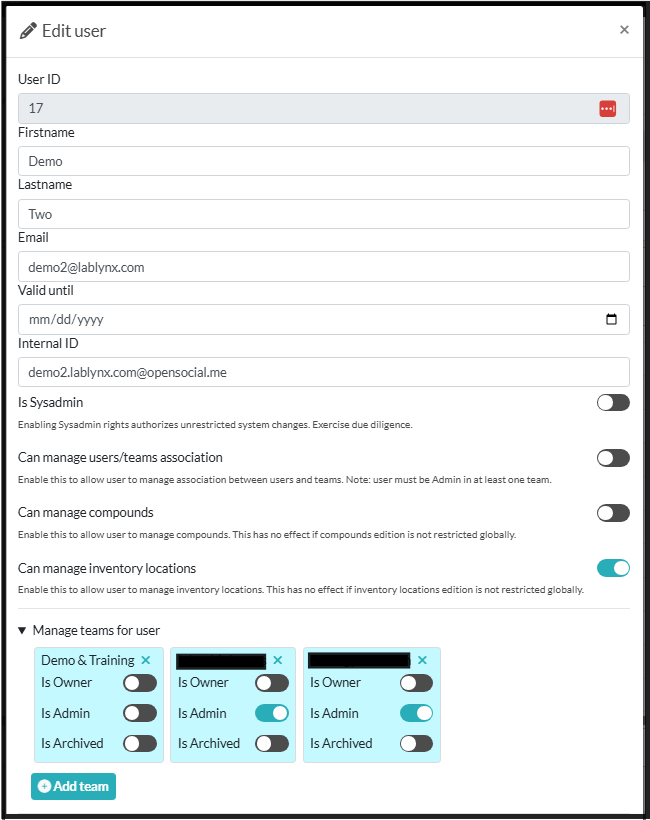 Permissions can be set for individual Users as well as User Groups. This page details the management of Users for Admins. Sysadmins have additional user management abilities.