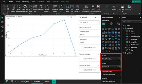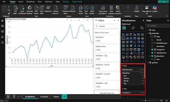 The first report examples create a line chart that has a date dimension (week or month) for the x-axis and a count of received samples as the y-axis. The GraphQL data source queries for samples that have been received between April and October of 2025. Since all data is already in a received state, the steps to build the report will not include PowerBI filters. This simplifies this section; in practice, reports will often require additional filtering.