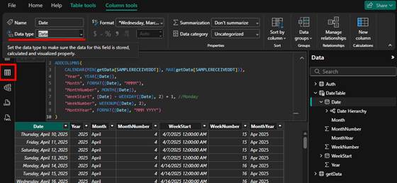 A DateTable will appear in the Data pane. When viewed in Table View, a table of dates will be shown. The first date will be the minimum SAMPLERECEIVEDDT, and the last date will be the maximum SAMPLERECEIVEDDT. The data in various columns is calculated and generally self-explanatory, though WeekStart does use a formula to calculate the date of the Monday that starts the week.